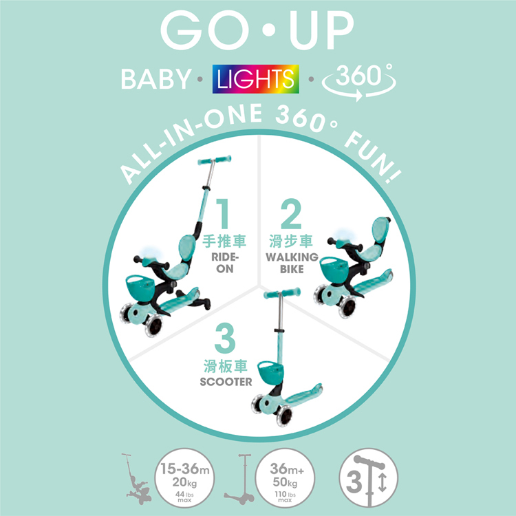 GLOBBER GO‧UP 豪華版360度多功能滑板車(白光發光前輪)-夢幻薄荷綠