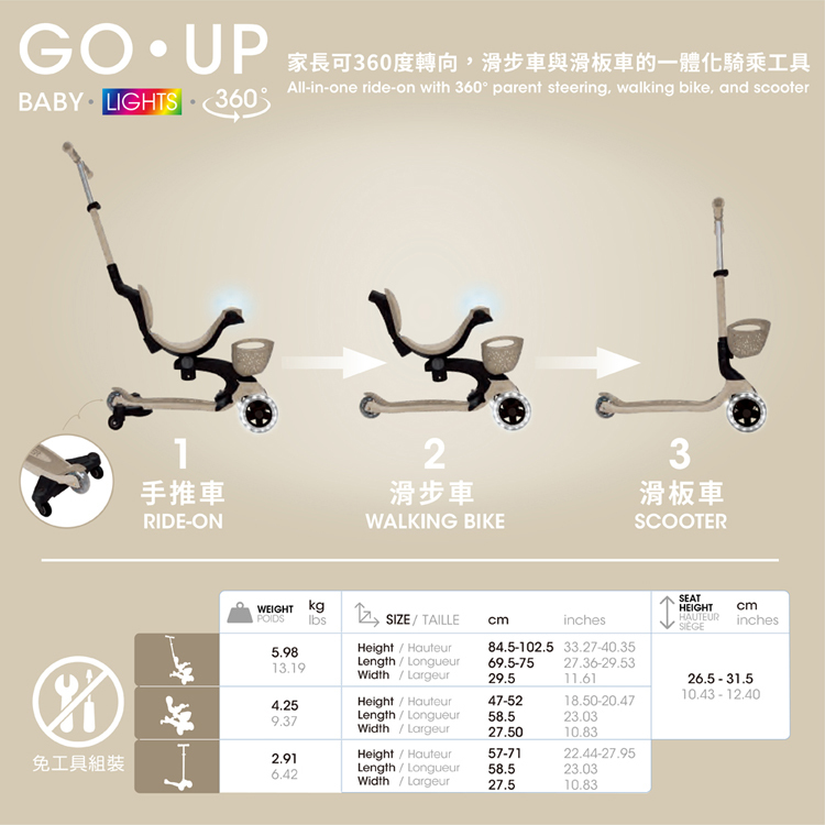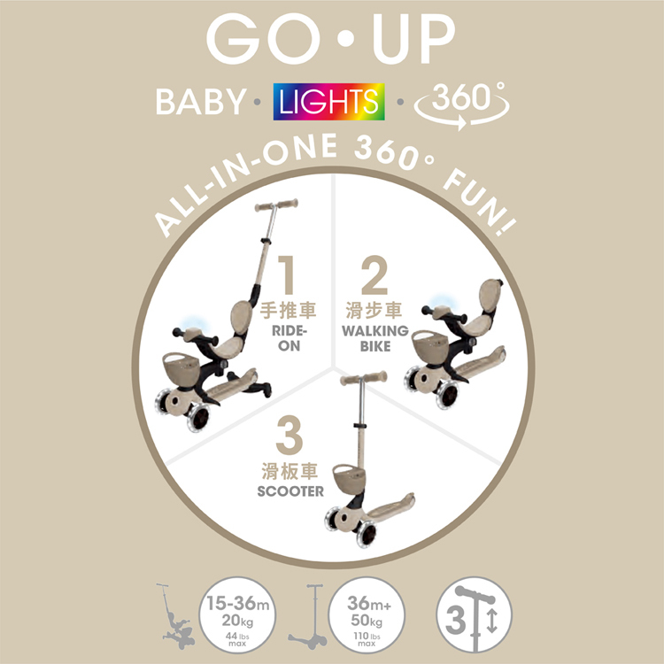GLOBBER GO‧UP 豪華版360度多功能滑板車(白光發光前輪)-燕麥奶茶色