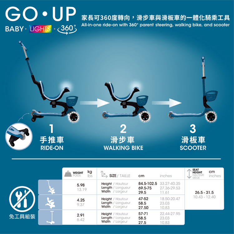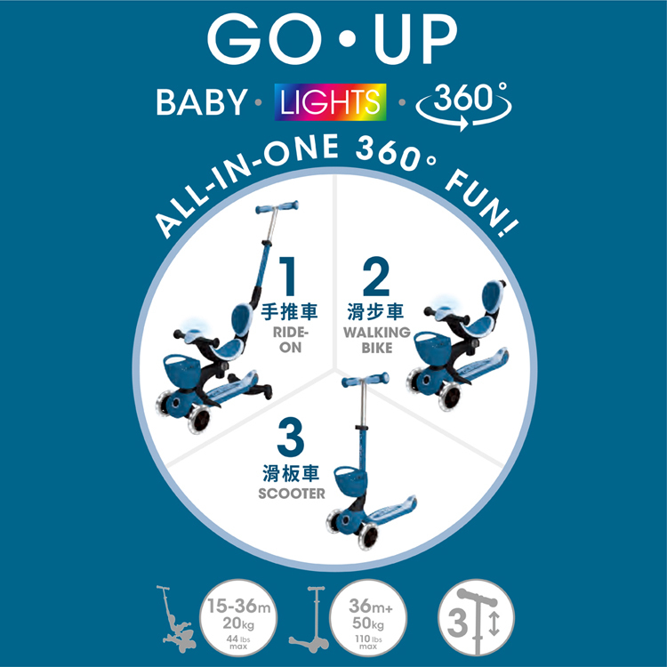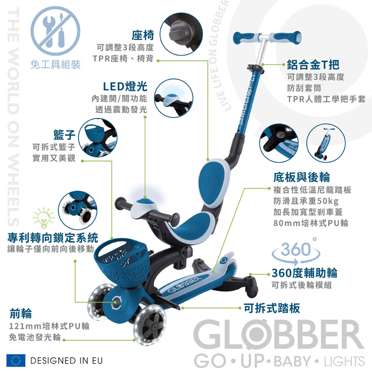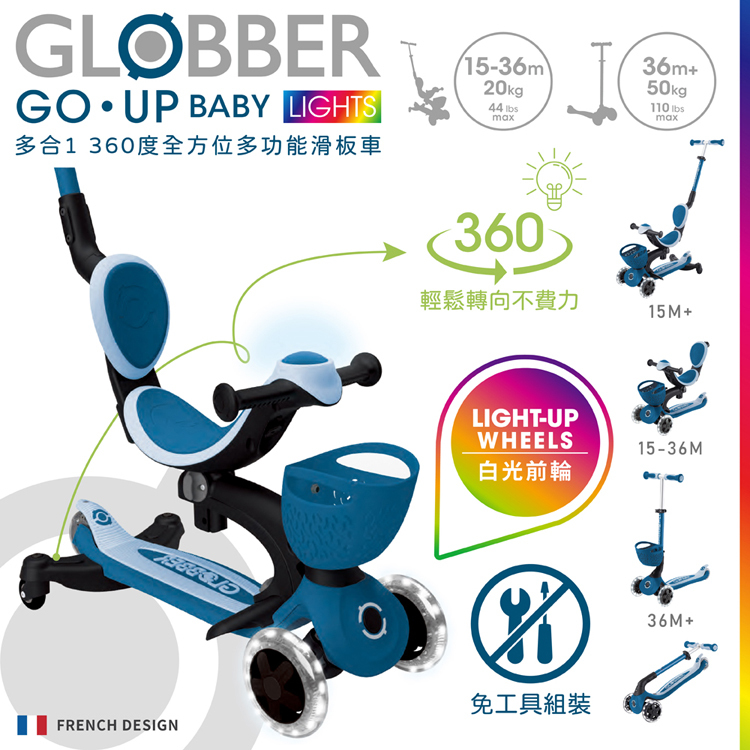 GLOBBER GO‧UP 豪華版360度多功能滑板車(白光發光前輪)-銀河系灰藍